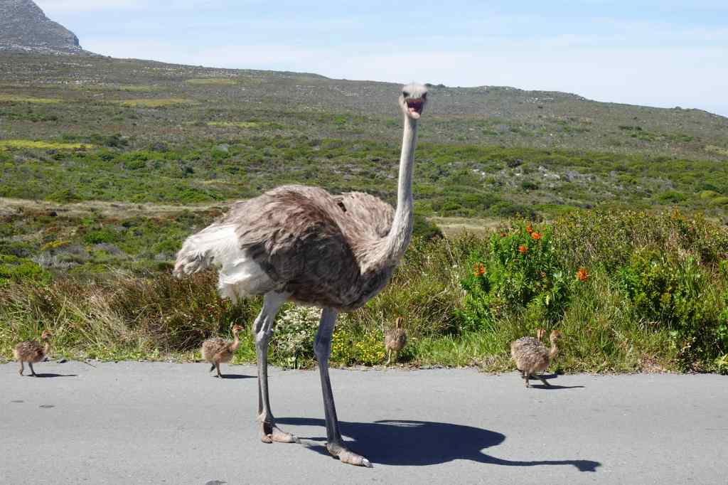 I regained my car and headed to the exit of the park. On the way, there was an unusual traffic jam caused by a pair of ostriches and their chicks. I got of out my car to take photos, but soon realised I had taken a silly risk. The mother ostrich perceived me as a threat and approached me aggressively. I remembered what the guide at the ostrich farm had told me about the birds being able to kill with a single blow from their feet and hurried back to my car. Maybe I was lucky to be a small teddy, and less of a threat then a taller human, because mother ostrich did not pursue me.