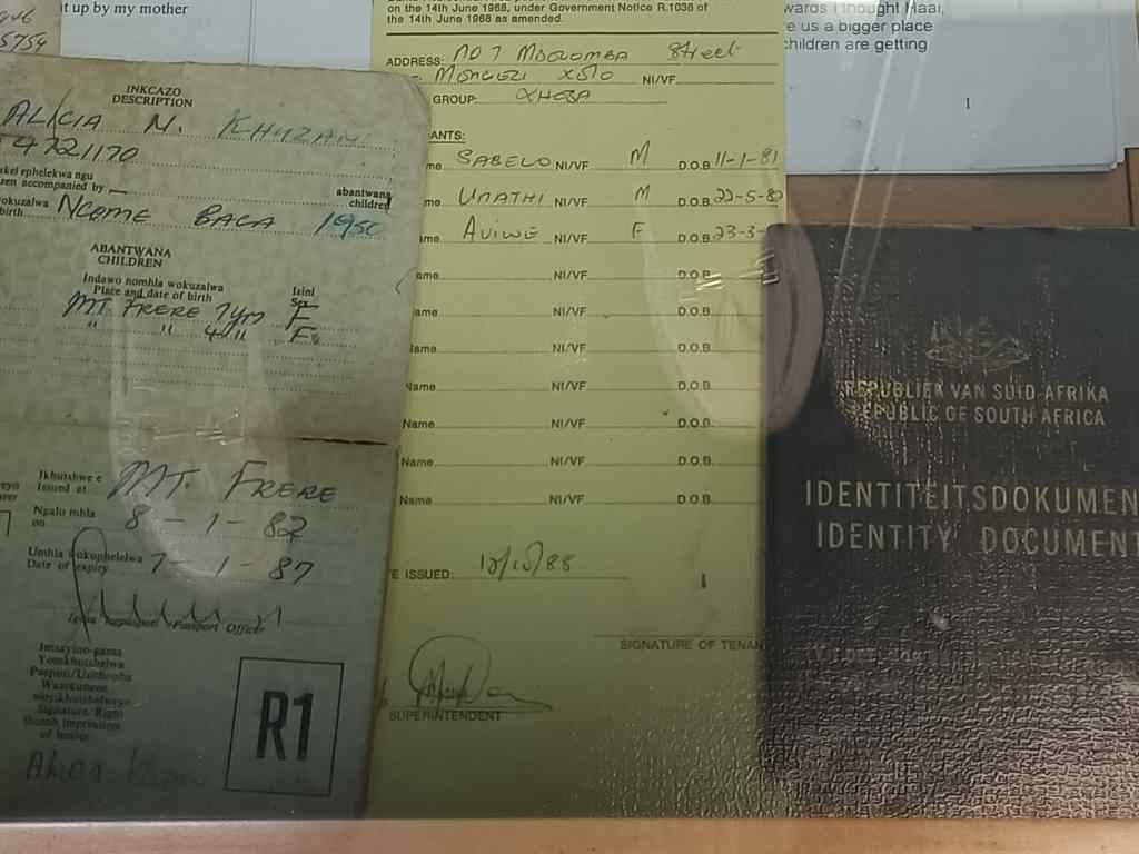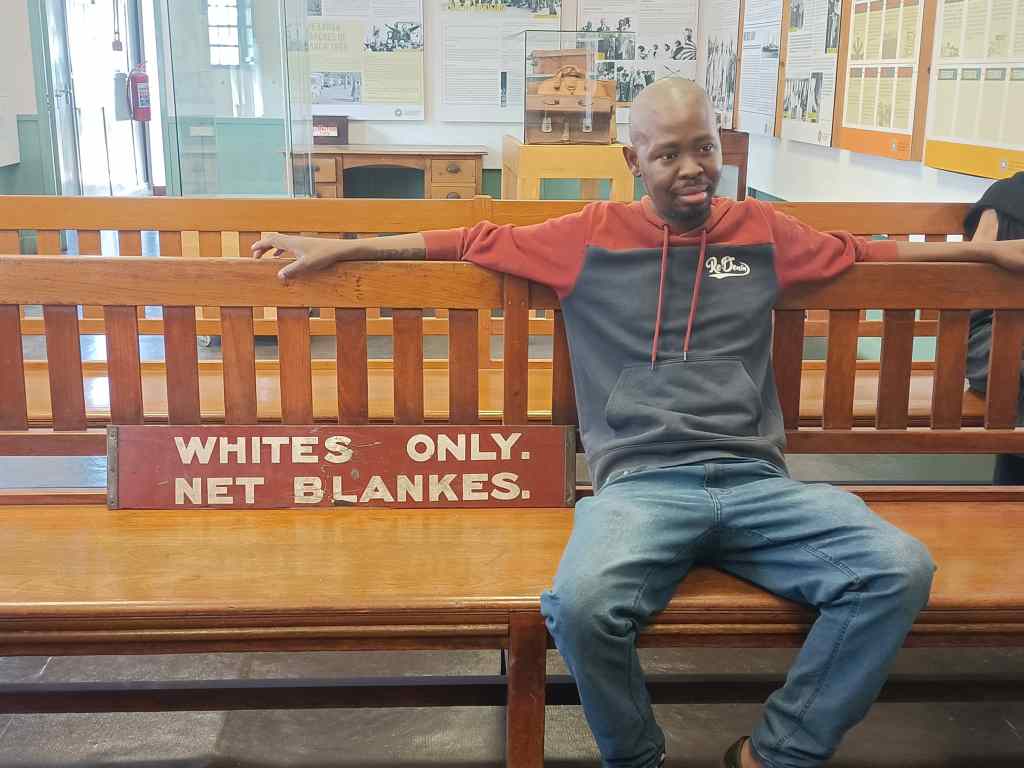 A “White’s Only” sign on a bench, with the curator’s sonThe hated Dompas and other ID documents