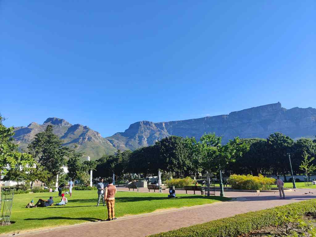 From Bo-Kaap, I walked to the City Bowl area – the heart of Cape Town. This is the main business area, and has shops, restaurants, high rise buildings (not quite skyscrapers though) and lots of top end hotels. By day, it was a pleasant and obviously affluent area, with people strolling from café to café. I soon found the Company’s Garden, which is the city’s oldest green space. It was set up by the East India Company in 1652 to grow fruit and vegetables for the fledgling Cape Town colony. In the following century it was transformed into ornamental gardens, and became famous around the world. On this late Sunday afternoon, centuries later, it was full of people enjoying the collections of exotic trees and flowers or just sitting on the grass. Couples enjoyed picnics together, parents played with their children, and at least one marriage was being celebrated.