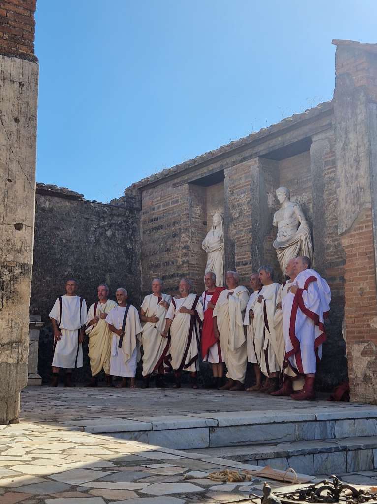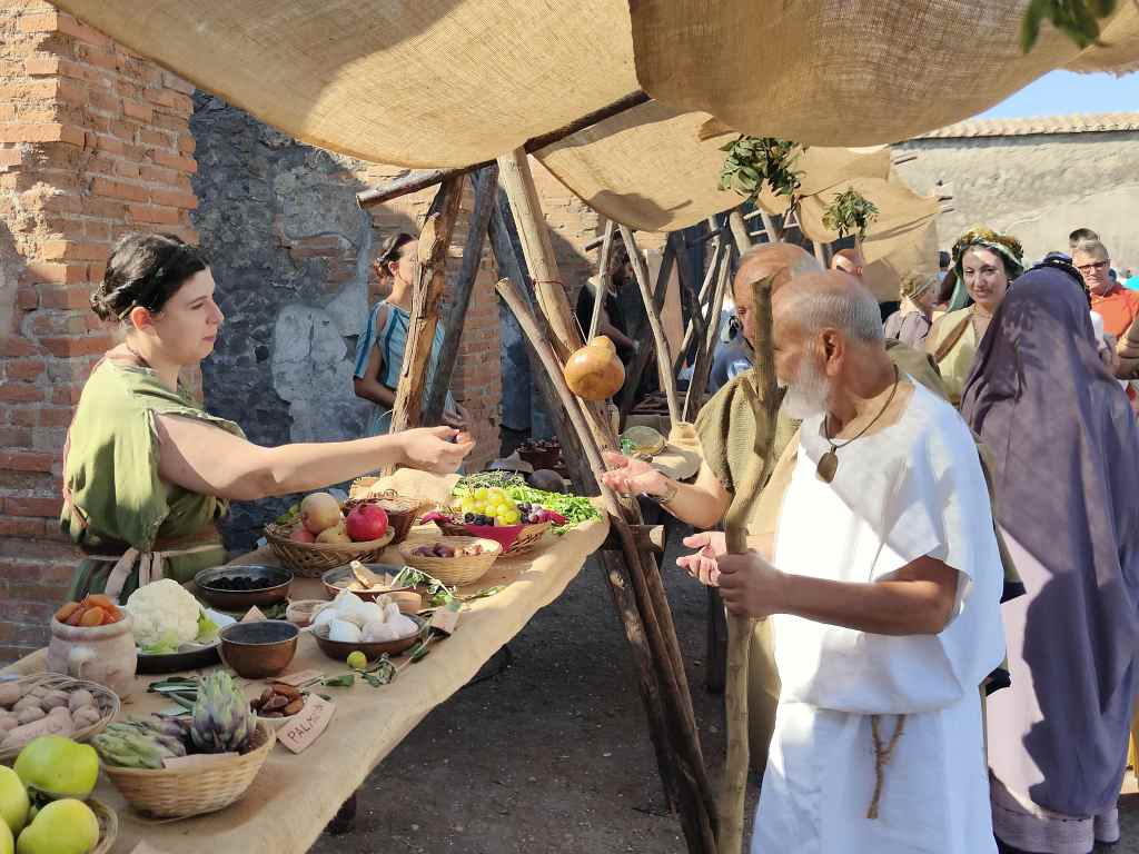 My first stop was the forum. Since this is located on the only road in from the main entrance, it is also everyone else’s first stop, and it was quite crowded. But it was still very impressive, with a fine view of the ruins and Vesuvius towering in the background. I was visiting on National Monuments Day, and to celebrate this the park authorities had arranged for staff to dress up as Romans and pretend to shop or participate in ancient religious rites.