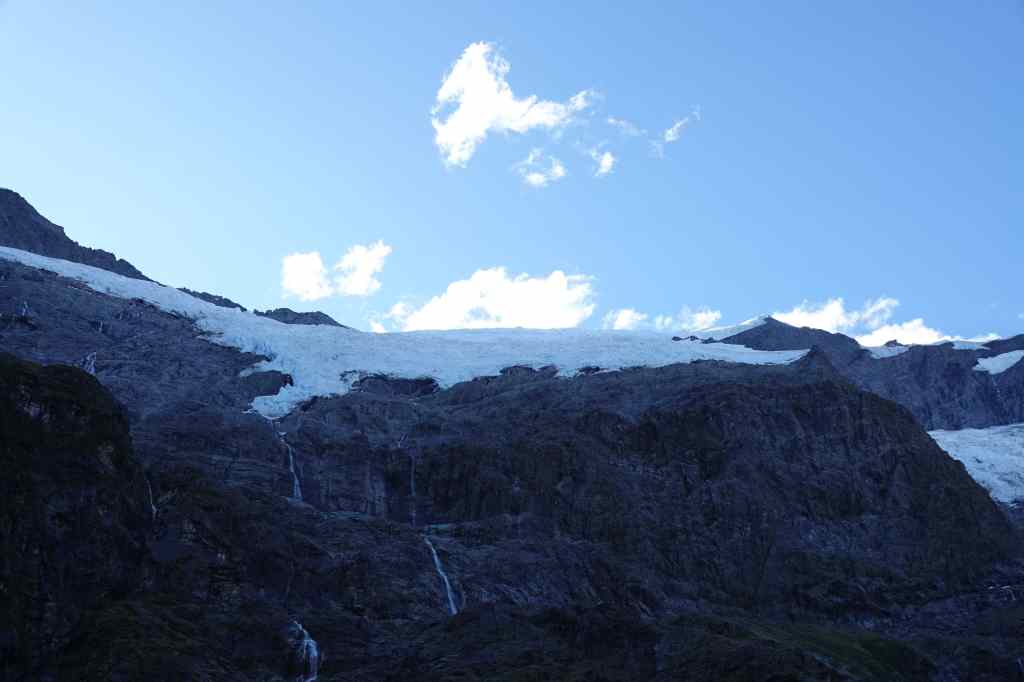 After a few kilometres the easy, wide path ended at a bar/restaurant and turned into a mountain track which passed over a mini glacier. At first, I wondered whether this was safe to cross – the ice had two large holes, through which you could hear the river bubbling below. But the much heavier human walkers set across confidently, so I followed in their footsteps (literally) and was soon clambering up the rocky scree that lies at the base of the cirque.