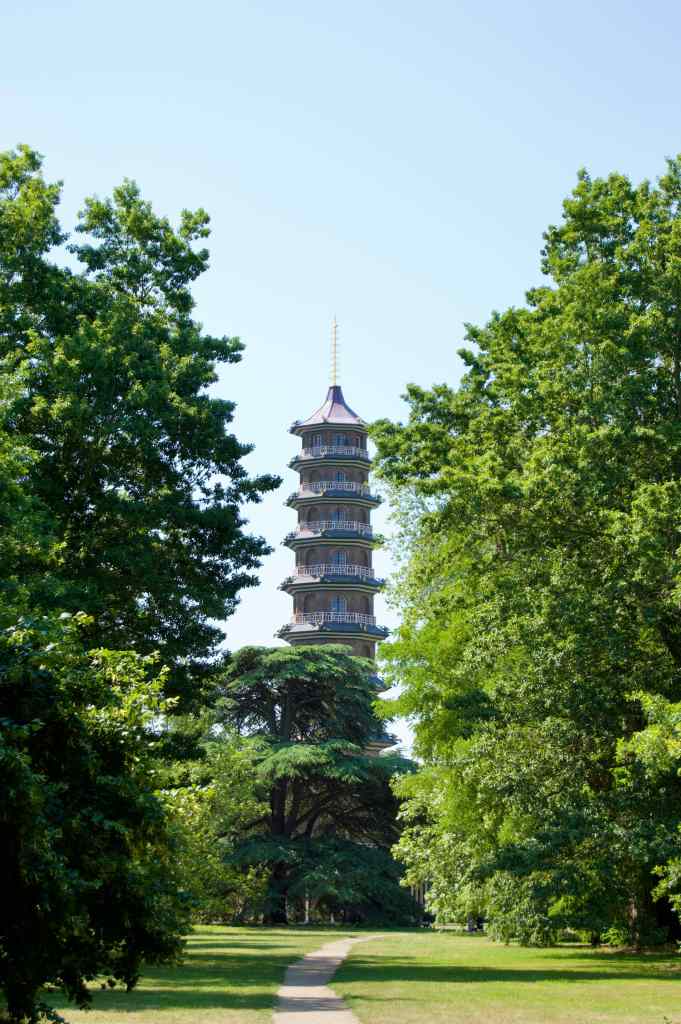 After the spring flowers, summer at Kew is a time to explore the long avenues with the fine views – like this avenue leading up to the Japanese pagoda